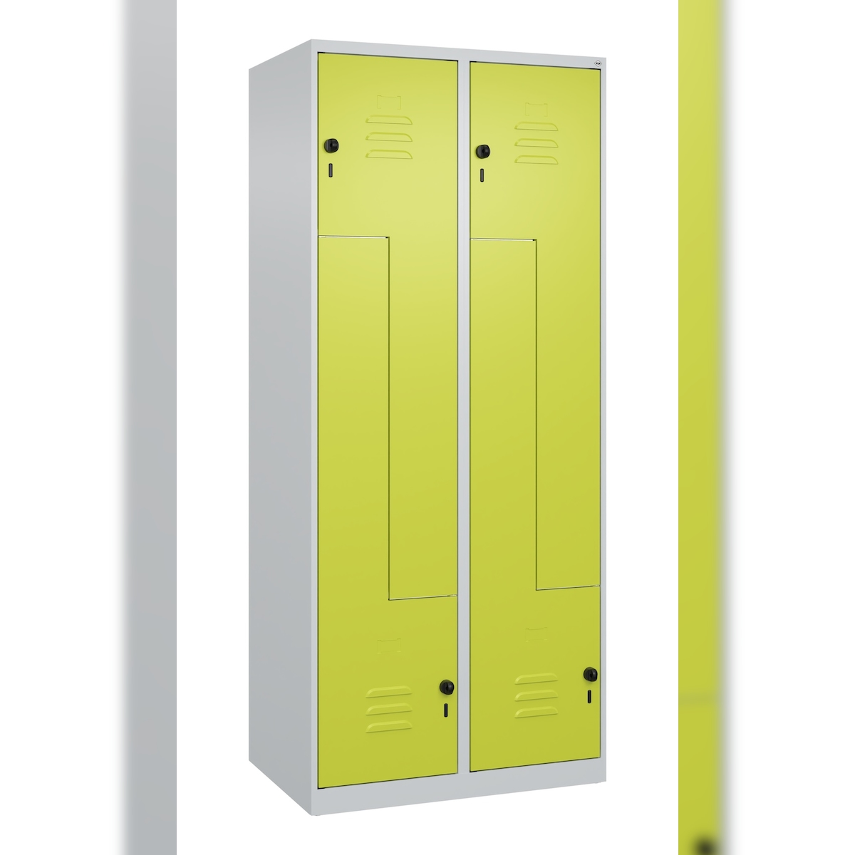 C+P Z-Spind Classic PLUS bodenstehend, 4 Abteile, HxBxT 185x80x50cm, Sicherheitsdrehriegel, Hellgrau/Clowngrün von PROREGAL