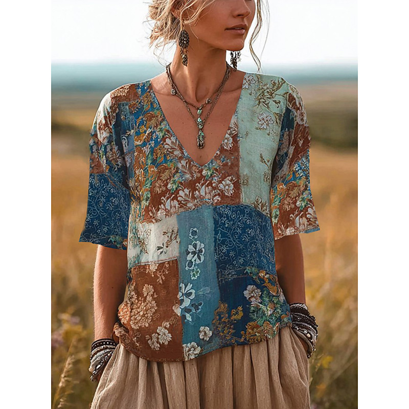 Women's T Shirt Floral Graphic Plants Vintage Stylish Classic Short Sleeve V Neck Regular Tops Daily Weekend Vacation Wear Print Blue Yellow Summer Spring