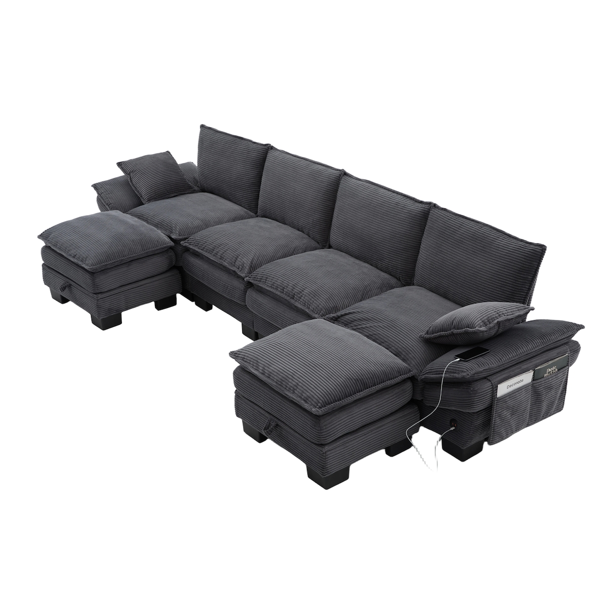 Merax 4-Sitzer-Sofa mit 2x Hocker, USB-C-Anschluss & Seitentaschen, Dicke Kissen, Corduroy, Dunkelgrau
