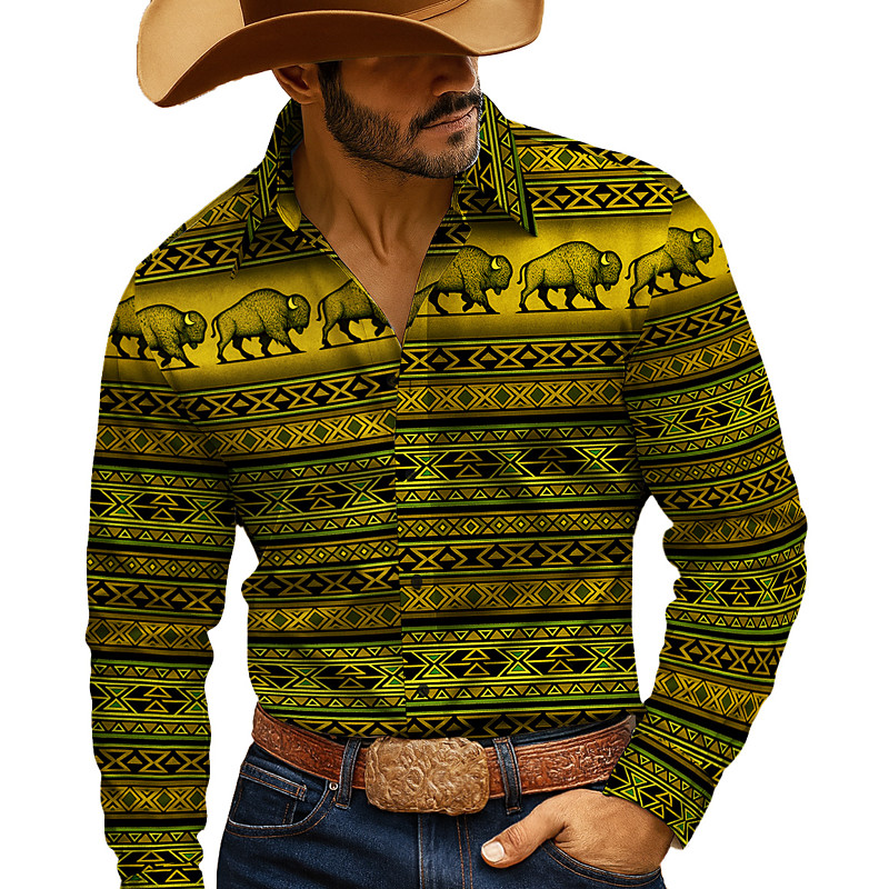 Men's Buffalo Plaid Cowboy Indian Culture Shirt Western Shirt Button Up Shirt Long Sleeve Vintage Retro Outdoor Casual WorkWear Spring Fall Turndown 3D Print Collared Shirts Blue Brown Green