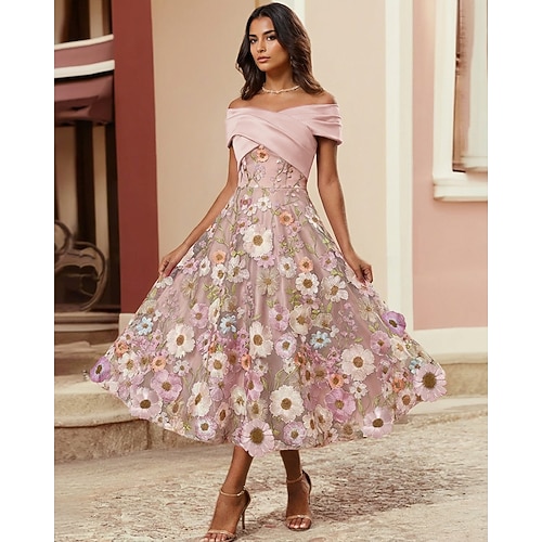 Tubino Colonna Lunghezza Tè Perline ricamate Abito Formale Abito da madre della sposa Abiti da Cocktail Abiti da festa Elegante Floreale Manica Corta Girocollo Festa in giardino Matrimonio Vestito