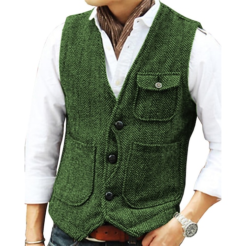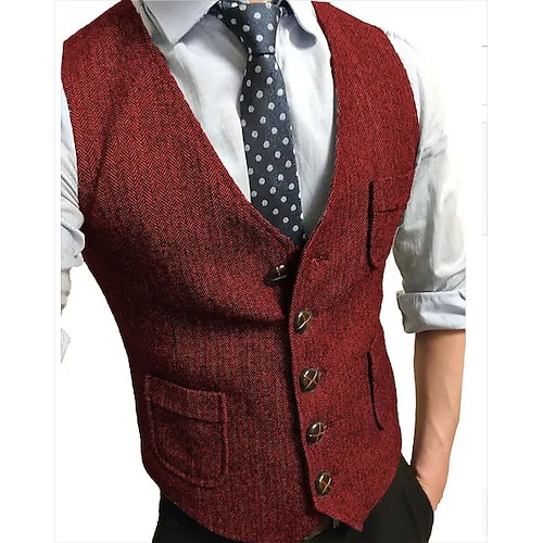 Per uomo Gilet in tweed Gilet Formale Matrimonio Vacanza Quotidiano Moda Classico Primavera Autunno Tasca Bottoni Confortevole Spina di Pesce Monopetto Scollo a V Vestibilità su misura Rosso Borgogna