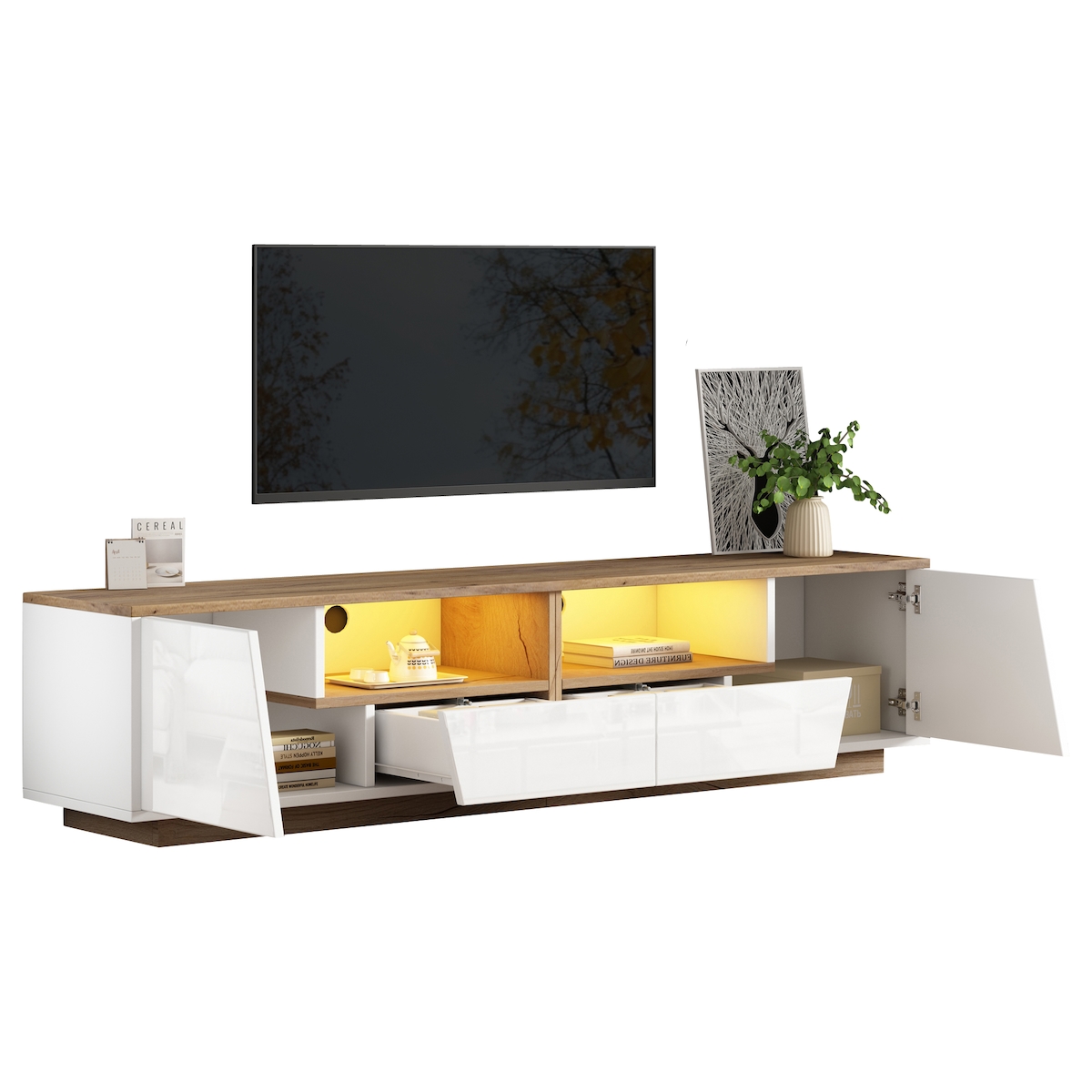 OKWISH TV-Schrank 180x40x46 cm Hochglanz LED-Lichtleiste 2 Schubladen 2 Schränke Halboffen Stauraum Holz Weiß Wohnzimmermöbel