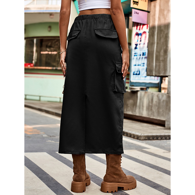 Women's Skirt A Line Fashion Casual Midi High Waist Skirts Plain Drawstring Pocket Micro-elastic Street Daily Black Army Green Khaki Light Grey Spring Cotton Blend Denim
