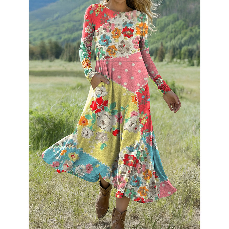 Women's Midi Dress A Line Dress Fit And Flare Dress Vacation Casual Daily Regular Fit Floral Graphic Long Sleeve Crew Neck Pink Red Orange Rainbow Spring Fall Winter