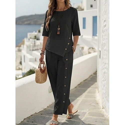 Per donna Set da due pezzi Set di Pantaloni Finto cotone e lino Mezza Manica Girocollo Semplice Moda Streetwear Casuale Quotidiano All'aperto Nero Bianco Verde Primavera Estate Vestibilità regolare