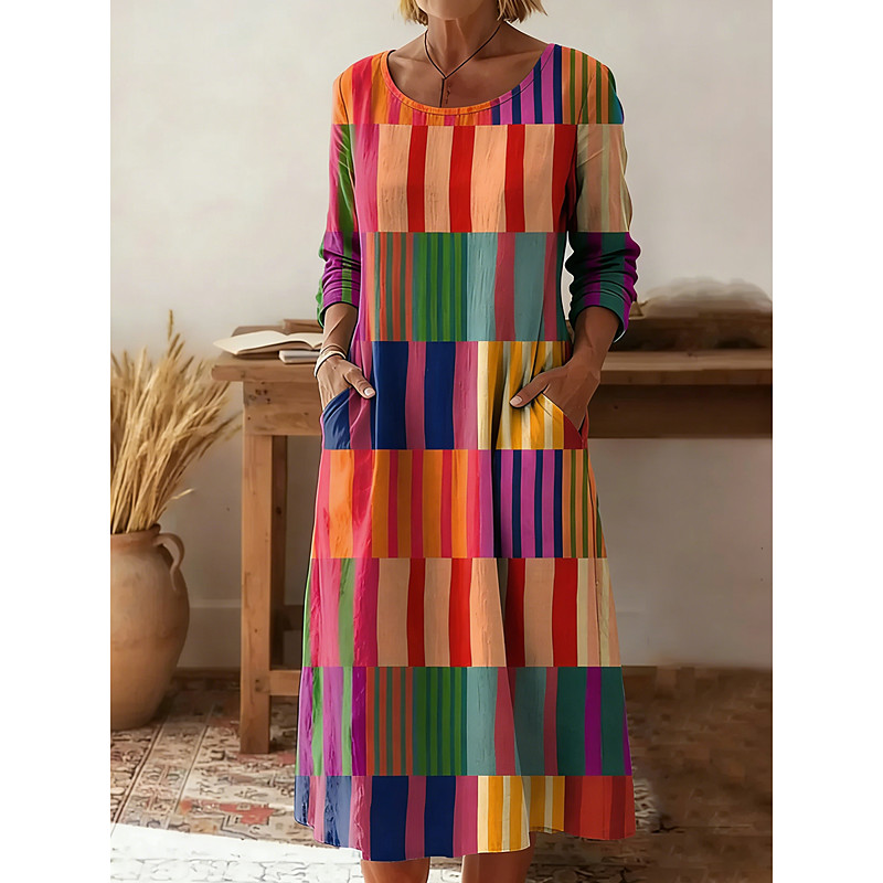 Women's Midi Dress V Neck Long Sleeve Kaftan Lightweight Loose Fit A Line Dress Casual Boho Going out Graphic Geometric Stripe Long Sleeve V Neck Orange red Black Yellow Pink