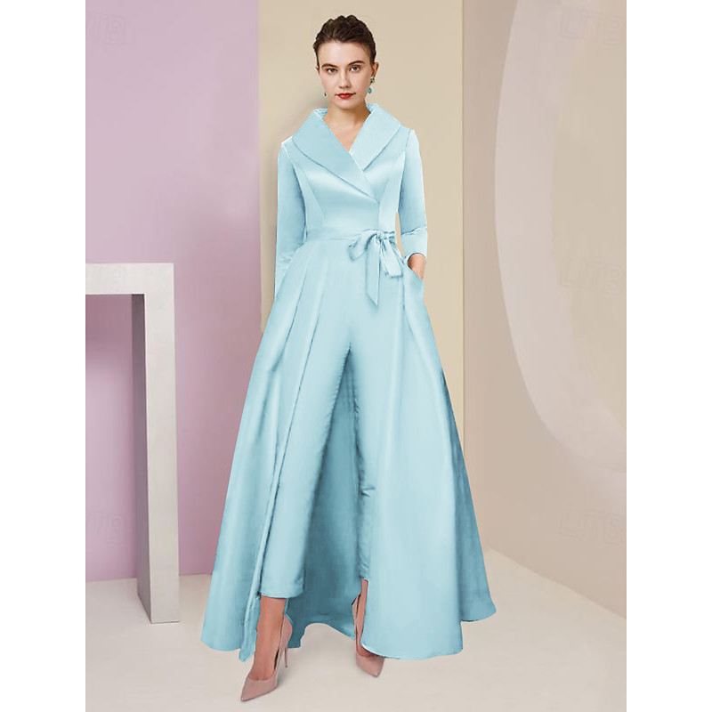 Jumpsuit Pantsuit Ankle Length Mother of the Bride Dress 3/4 Length Sleeve Shirt Collar Elegant Party Simple Formal Wedding Guest Satin with Bow(s)