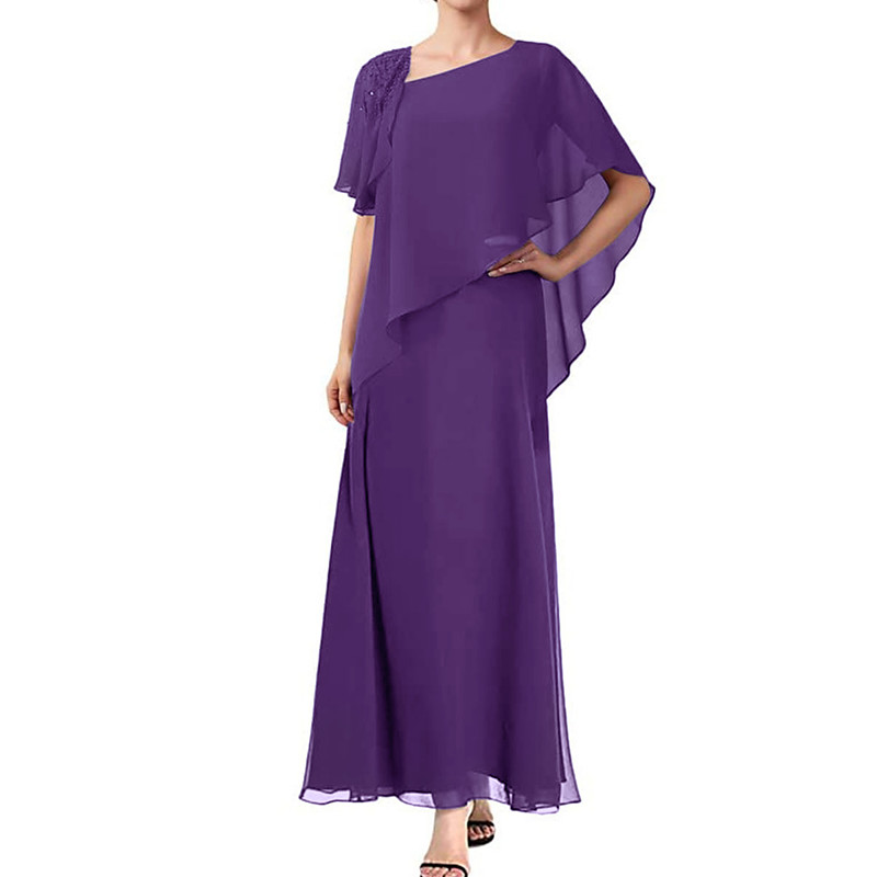 A-Line Asymmetrical Ankle Length Wedding Guest Dress Formal Dresses Flare Dress Mother of the Bride Dress Short Sleeve Bateau Neck Elegant Formal Wedding Guest Chiffon with Pleats Flower