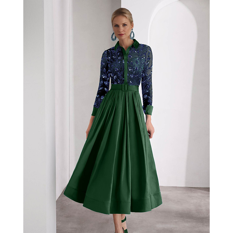 A-Line Floor Length Beaded Eembroidered Shirt Dress Wedding Guest Dress Mother of the Bride Dress Long Sleeve Bateau Neck Elegant Formal Sequined with Lace Sash / Ribbon