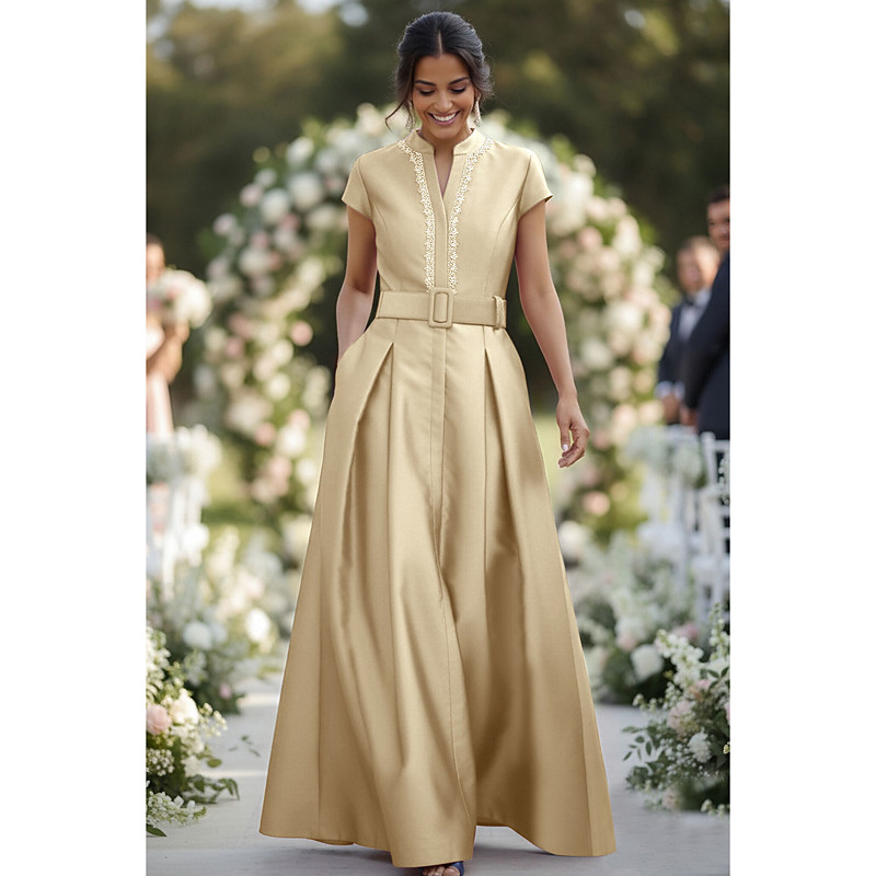 A-Line Floor Length Evening Gown Ball Gown Formal Dress Elegant Short Sleeve Off Shoulder Wedding Formal Champagne Mother Of the Bride Dress Satin with Glitter Pocket
