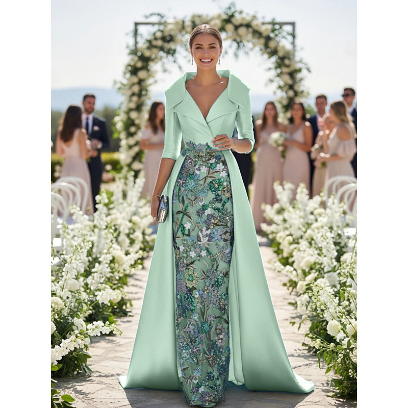 A-Line Sheath Column Floor Length Beaded Eembroidered Wedding Guest Dress Formal Dresses Mother of the Bride Dress 3/4 Length Sleeve V Neck Shirt Collar Elegant Vintage Luxurious Formal Satin with