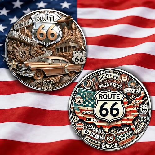 moneta commemorativa Route 66 – 100 anni di libertà, moneta souvenir da collezione, regalo di viaggio vintage americano, design di motociclette e auto d'epoca, ricordo del centenario