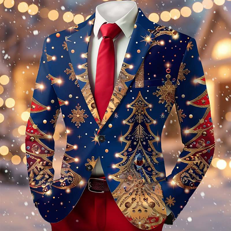 Christmas Men's Christmas Tree Blazer Jacket Comfortable Artistic Casual Party Evening Wear Daily Festival Buttons Print Spring Fall Winter Notch Long Sleeve Red 1 Red Blue