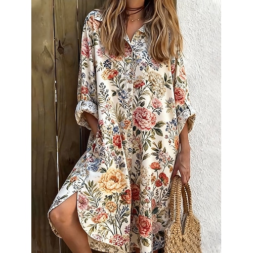 Per donna Abito al ginocchio Abito a Tubino Vestito Casual Moda Moderno Quotidiano Vacanza Uscire Vestibilità comoda Floreale A righe Manica Lunga Colletto a Camicia Blu Rosso Marrone Cachi Primavera