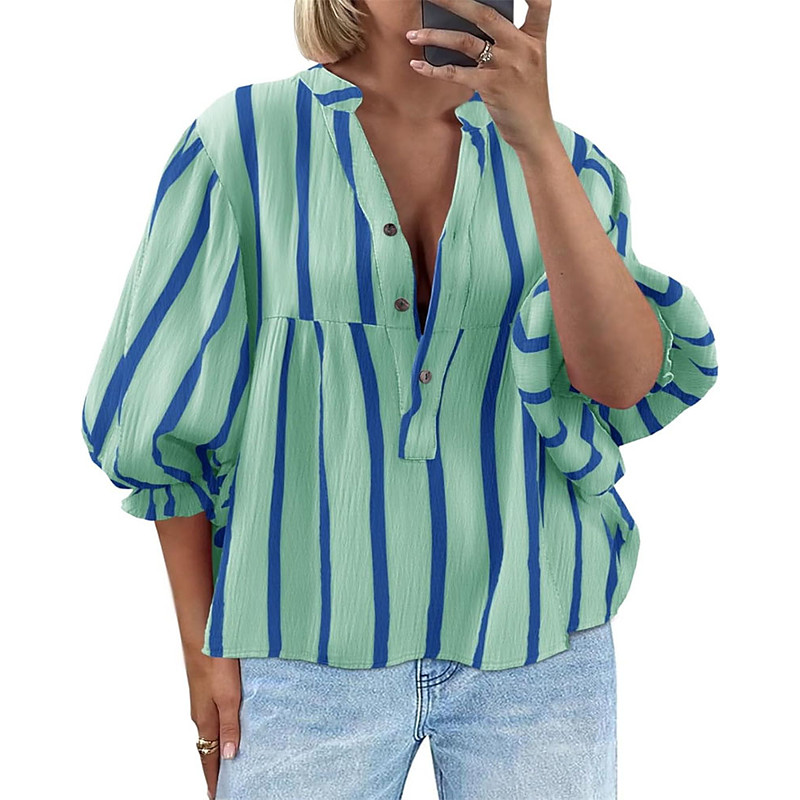 Women's Shirt Blouse Dressy Tops Plain Striped Elegant Vintage Ladies Long Sleeve Puff Sleeve V Neck Regular Tops Daily Work Holiday Ruched Patchwork Buttons Blue Yellow Pink Green Fall Winter