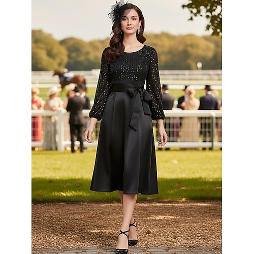 Linea ad A Lunghezza al ginocchio Abito in Raso Abito nero Vestito da Festa Abito da cerimonia per signora Manica Lunga Girocollo Scollo Tondo Elegante Vintage Abito Nero Formale Ospite di nozze