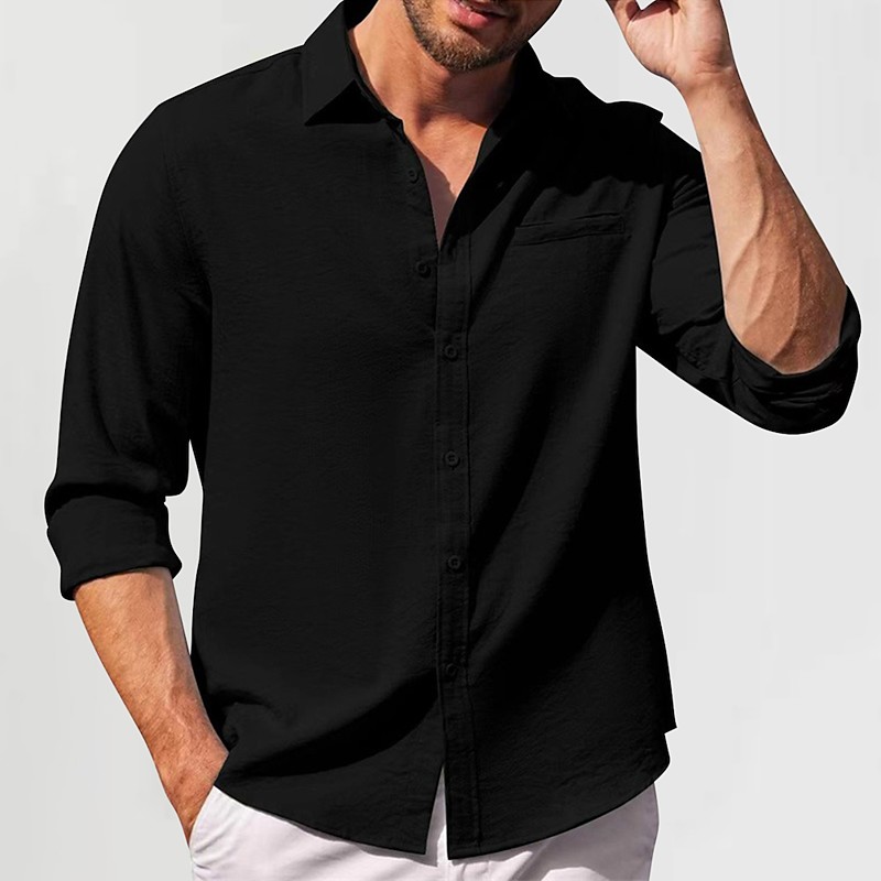 Men's Cotton Linen Shirt Plain Vacation Black White Green Apricot Long Sleeve Lapel Clothing Apparel Front Pocket