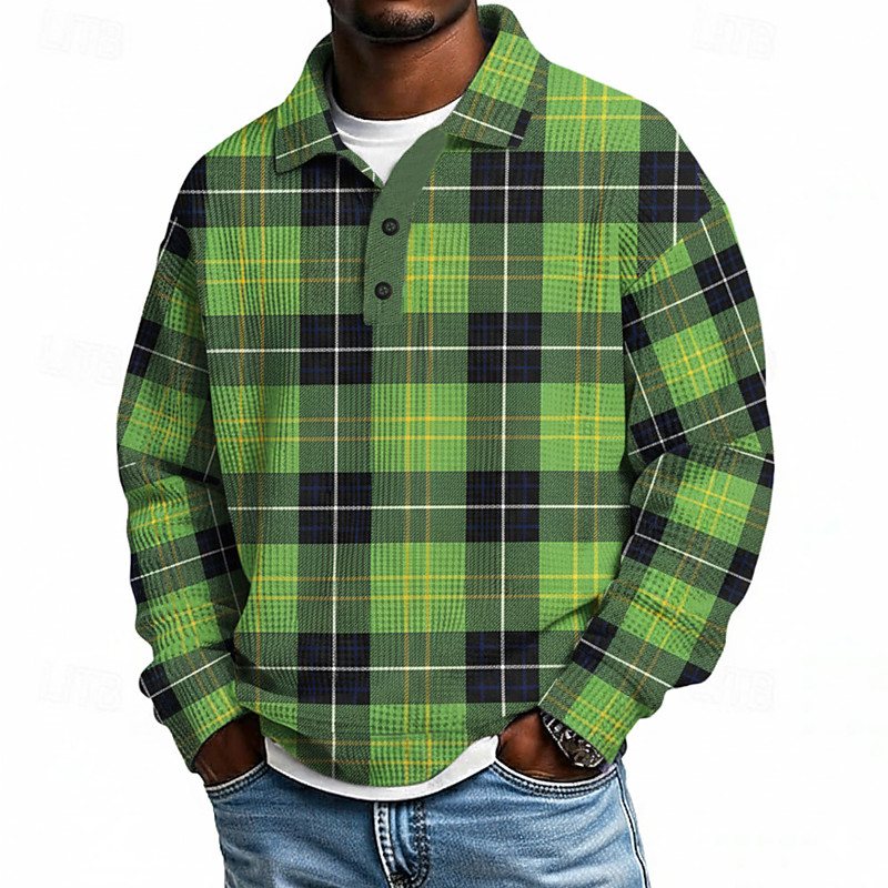 St. Patrick Men's Plaid Waffle Polo Shirts Long Sleeve Polo Shirts Lapel Casual Athleisure Daily Wear Festival Outfit 3D Print Spring Dark Green Green