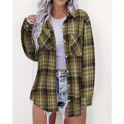 Damen Hemdjacke Shacket warm halten Atmungsaktiv Knopf Tasche Bedruckt Brautkleider schlicht Plaid Urlaub Strasse Freizeitskleidung Ausgehen Einreihiger Verschluss Standard Umlegekragen Regular Fit