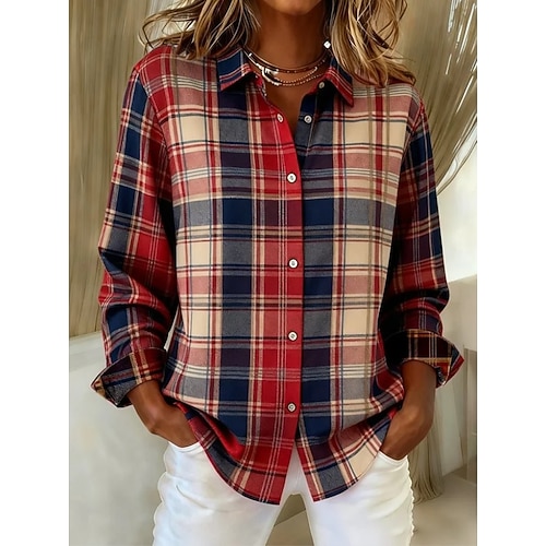 Per donna Camicia Blusa Grafico Geometrico Plaid Vintage Quotidiano Elegante Manica Lunga Colletto a Camicia Top Regolari Quotidiano Patchwork Bottoni Stampato Blu Rosso Cachi Primavera Autunno