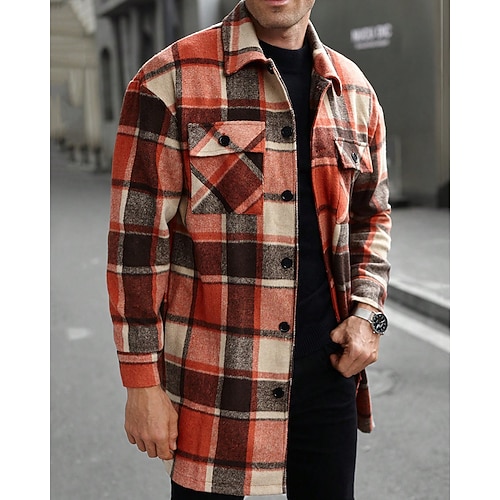 Per uomo Giacca-camicia Giacca camicia Giacca invernale Plaid Vacanza Abbigliamento quotidiano Nero Vino Arancione Cachi Manica Lunga Bavero Autunno Inverno Abbigliamento Tasca