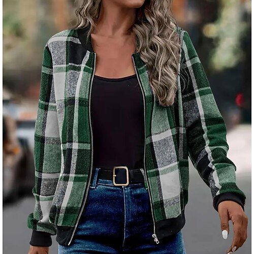 Per donna Giacca Invernale Antivento Caldo Cerniera Quotidiano Griglia Vacanza Casuale Regolare Collo alla coreana Vestibilità regolare Manica Lunga Capispalla Vino Rosso Verde Primavera Autunno