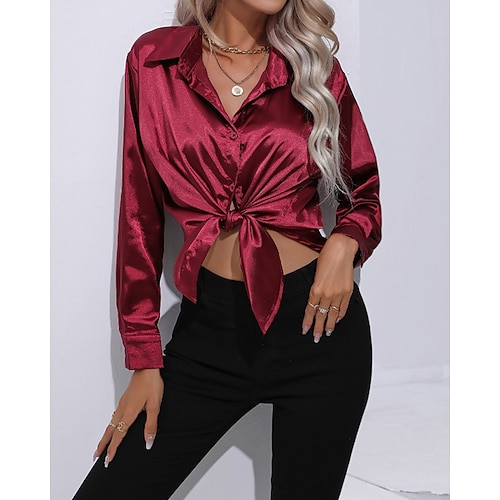 Per donna Camicia Elegant Raso/Satin Blusa Semplice Elegante Manica Lunga Scollo a V Top Regolari Quotidiano Lavoro Ferie Allacciato Nero Vino Verde Albicocca Estate Primavera Autunno