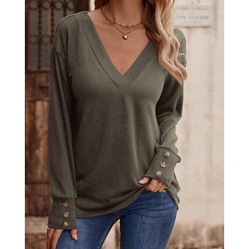 Per donna Maglietta Tinta unica Moda Elegante Classico Manica Lunga Scollo a V Top Regolari Quotidiano Uscire Weekend Bottoni Blu Nero Bianco Rosa Vino Primavera Autunno