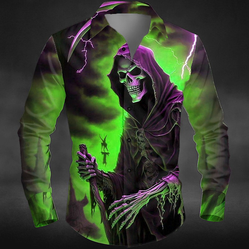 Halloween Men's Grim Reaper Lightening Death Shirt Button Up Shirt Long Sleeve Dark Punk Gothic Style Outdoor Holiday Summer Spring Turndown 3D Print Collared Shirts Yellow Orange Green