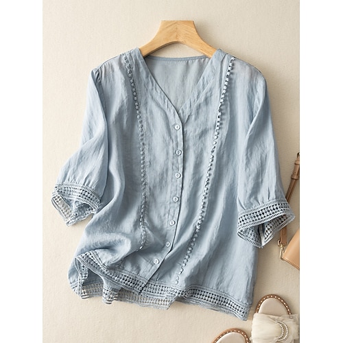 Per donna Camicie di cotone e lino Tinta unica Elegante Casual Manica 3/4 Scollo a V Top Regolari Quotidiano Pizzo Patchwork Nero Bianco Vino Blu marino Estate Primavera