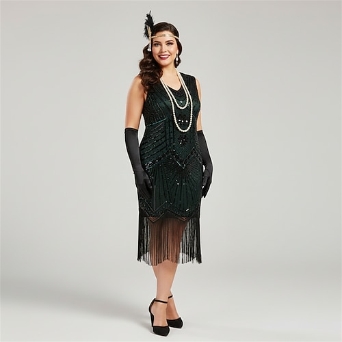 Set Anni Ruggenti Anni 1920 Abito da cocktail Midi Abito Flapper Vestito Abiti con accessori Senza maniche Il grande Gatsby Invitato al matrimonio Paillettes Frangia con nappe Scollo a V Costume Per