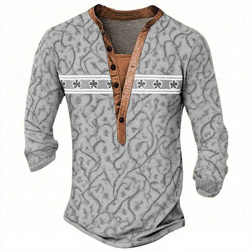 Men's Print Clover T Shirt Henley Shirt Long Sleeve Designer Retro Vintage Bohemian Street Casual Daily Summer Spring Fall Blue Brown Green khaki Grey Henley Henley T-Shirt