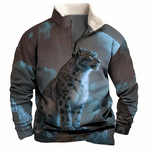 Herren Tiermotiv Leopard Fleece Pullover Mode Lässig 3D Stehkragen Viertelreißverschluss Outdoor Urlaub Geschenk Streetwear Blau Braun Halber Reißverschluss Herbst Winter Designer S M L XL XXL XXXL