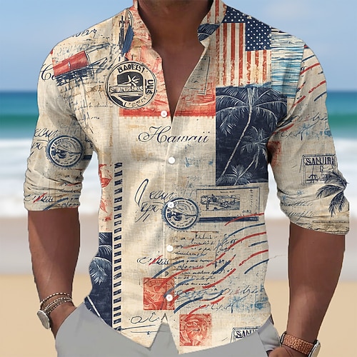 Per uomo Blocco di colori Albero di Cocco Bandiera Americana Camicia Camicie hawaiane Camicia con colletto alla coreana Manica Lunga Hawaiano Vintage Retrò Casuale Vacanza Primavera Autunno Collo