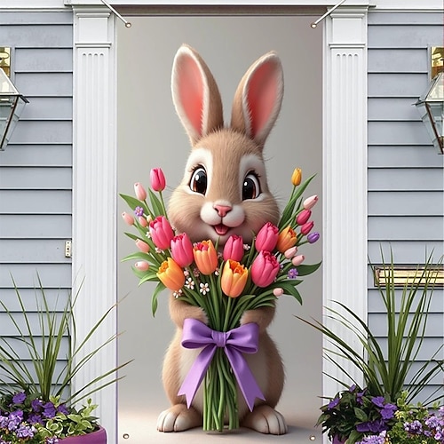 Copriporta a forma di coniglietto pasquale, adorabile coniglio con tulipani colorati e fiocco viola, affascinante decorazione primaverile per le vacanze di Pasqua, perfetta per porte e decorazioni