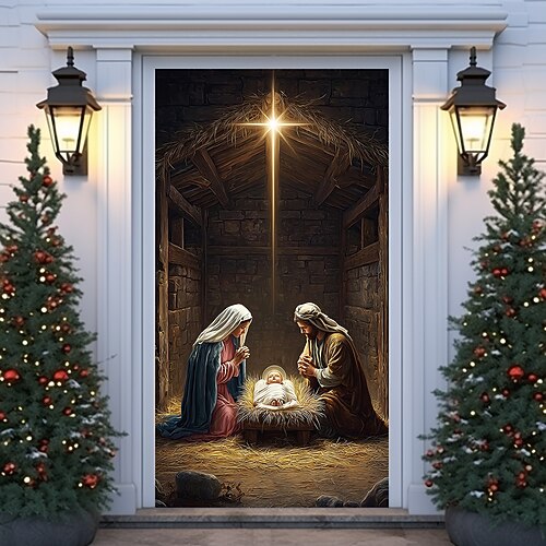 Copertura per porta natalizia, design del presepe, tenda natalizia, sfondo da appendere per l'ingresso di casa, decorazione a tema invernale, decorazione natalizia per le celebrazioni festive di