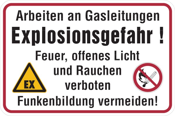 Hinweisschild, Arbeiten an Gasleitungen - 600 x 400 x 0.6 mm Aluminium geprägt