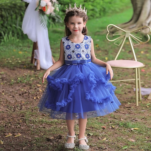 Abito da damigella d'onore bambina Ragazze Abito formale Abiti da sposa Feste Matrimonio Formale Principessa Patchwork Rete Floreale Senza Maniche Girocollo Blu Grigio Dai 4 anni in su