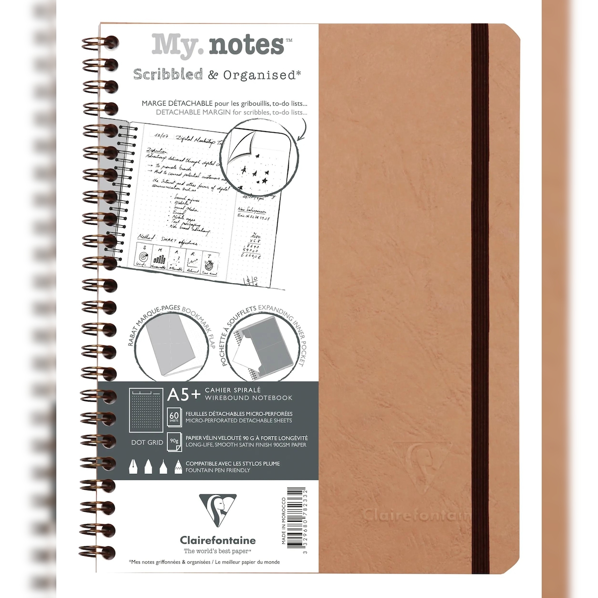 Clairefontaine 5x My.Notes Age Bag, Spiralheft A5+, 60 Blatt 90g, DOT mit Kopfleiste, abtrennbar, mikroperforiert - Tabak 78233C