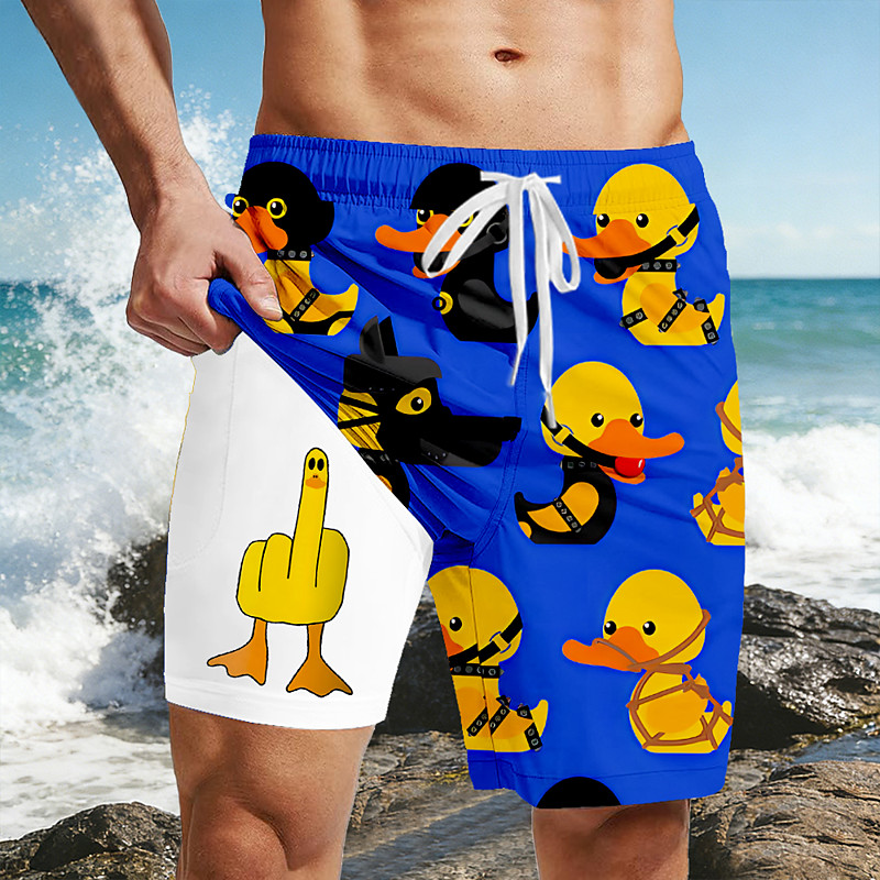 Men's Cartoon Duck Middle Finger Lined Shorts 2 in 1 Board Shorts Swim Shorts Mid Waist Hawaiian Funny Beach Vacation Wear Side Pockets With Compression Liner Elastic Drawstring Waist Designer