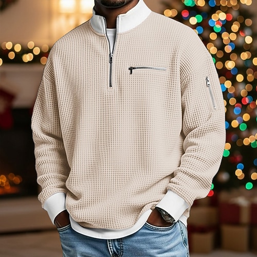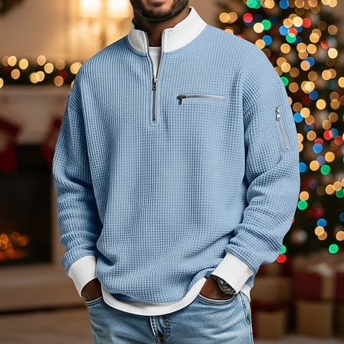 Per uomo Maglietta Waffle Maglietta Manica Lunga Mezza zip Autunno Autunno Inverno Tinta unica Tradizionale / Vintage Casual Blocco di colore Tasca con cerniera All'aperto Casa Sport Outdoor Blu