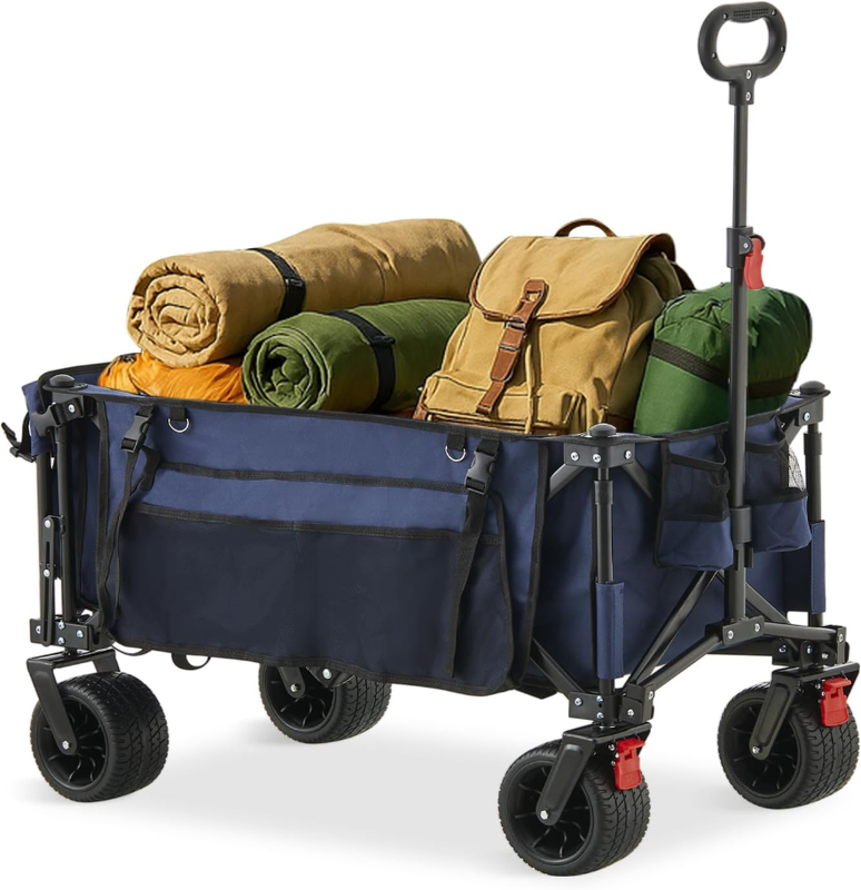 CLIPOP Festival Trolley with All-Terrain Wheels, 180L Folding Wagon with Expandable Tailgate and Adjustable Handle Large Capacity Garden Cart for Beach Camping Outdoor Blue