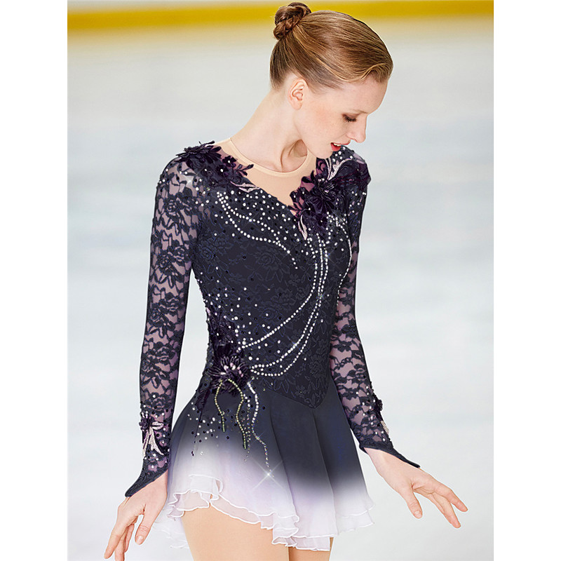Figure Skating Dress Women's Girls' Ice Skating Dress Outfits Violet Black White Patchwork Mesh Spandex Lace High Elasticity Competition Skating Wear Handmade Crystal / Rhinestone Long Sleeve Ice