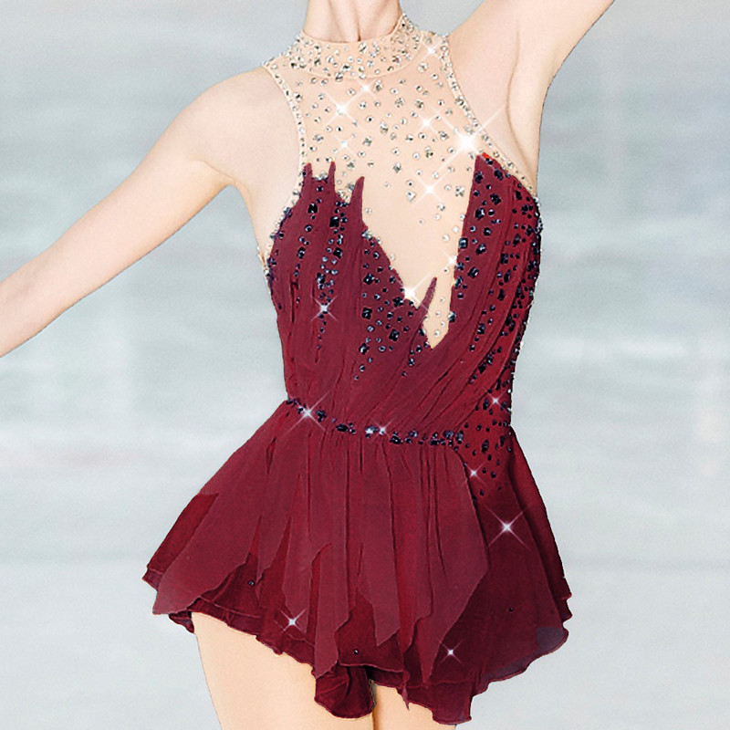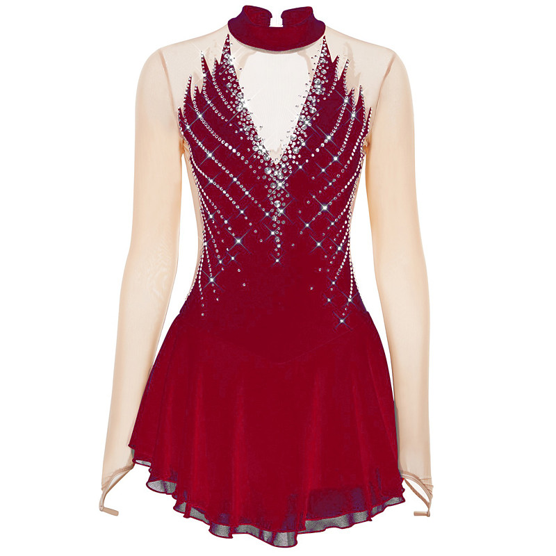 Figure Skating Dress Women's Girls' Ice Skating Dress Red Thumbhole Asymmetric Hem Mesh High Elasticity Training Competition Skating Wear Classic Crystal / Rhinestone Long Sleeve Ice Skating Figure