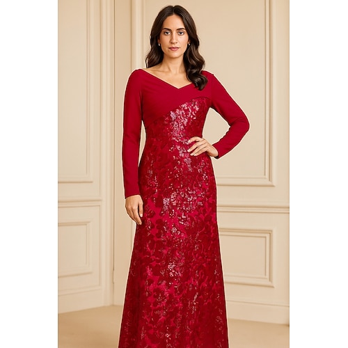 Abito da sera A-Line rosso blu elegante formale lungo fino al pavimento con maniche lunghe scollo a V in pizzo con glitter e paillettes