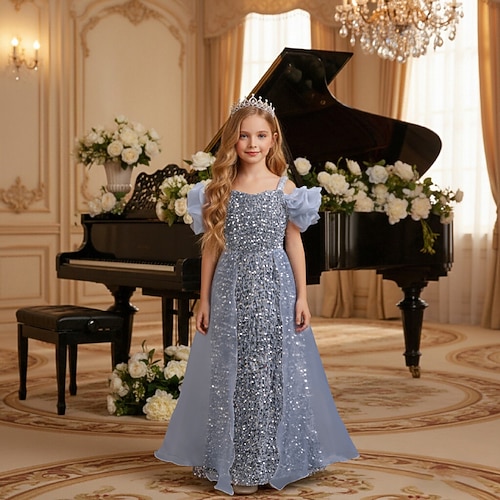 Blumenmädchenkleid Mädchen Formelle Kleidung Hochzeitskleidung Party Hochzeit Formell Elegant Mode Prinzessin Pailletten Einfarbig Ärmellos Rundhalsausschnitt Blau Silber Ab 4 Jahren