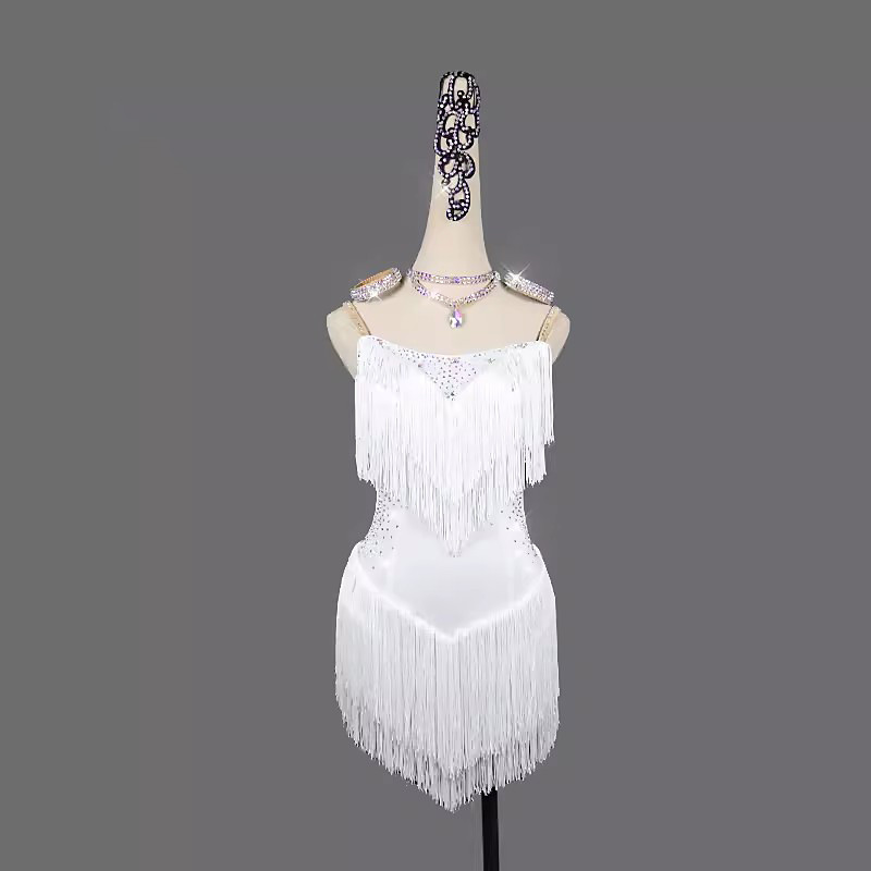 Latin Dance Dress Rhinestone Tassel Women's Performance Training Long Sleeve High Spandex Tulle