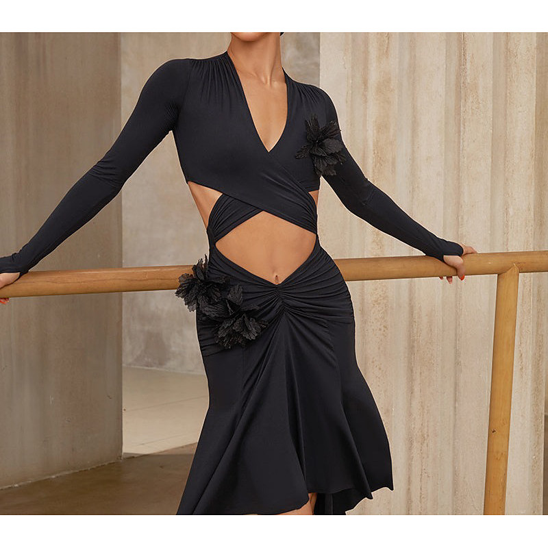Latin Dance Dress Splicing Women's Performance Training Party Long Sleeve High Nylon