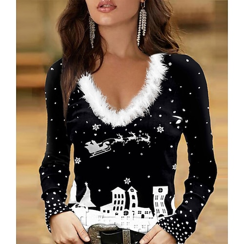 T-Shirt da Donna Natale Manica Lunga Festiva Collo a V Collo Peluche Top Casual per Feste Invernali Stampa Nera